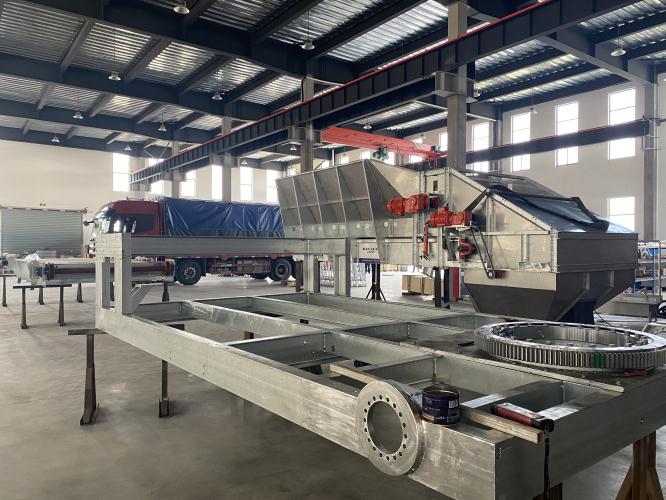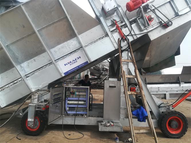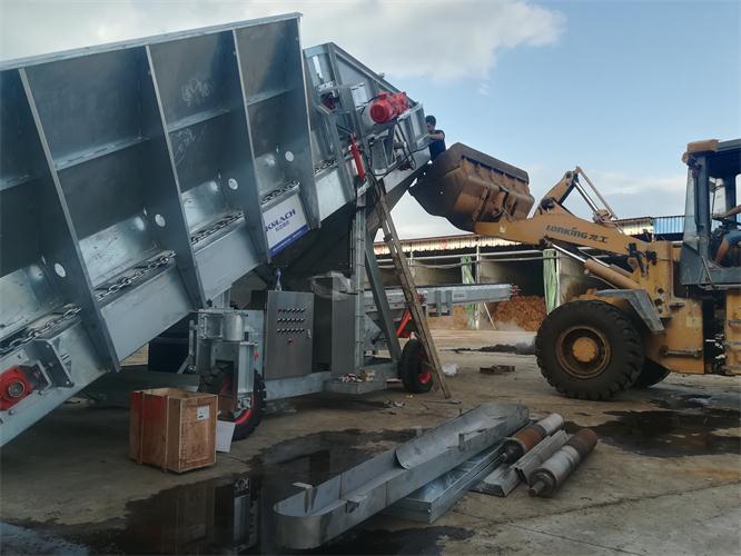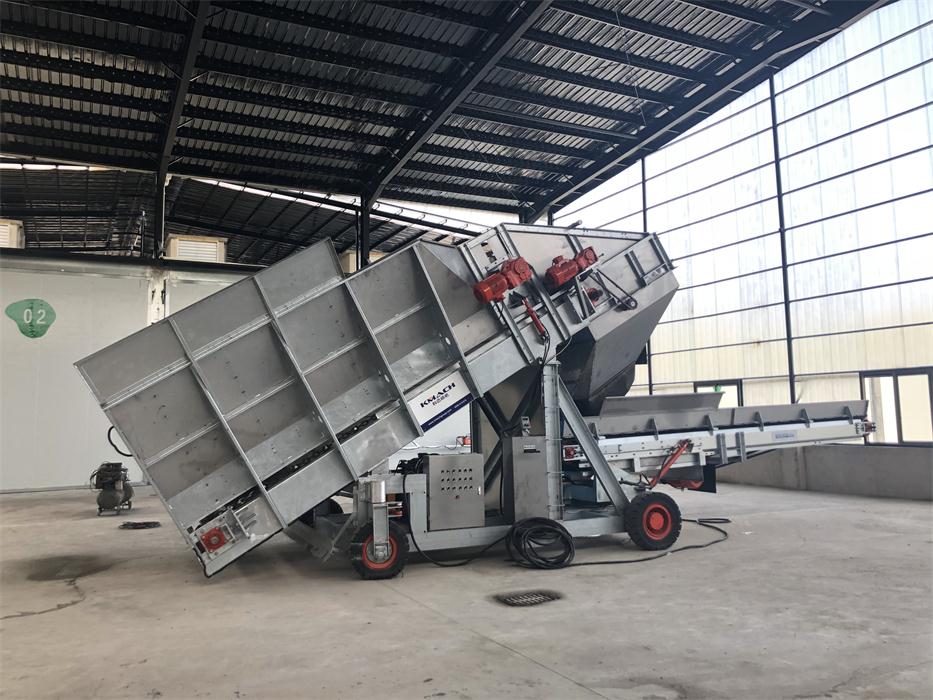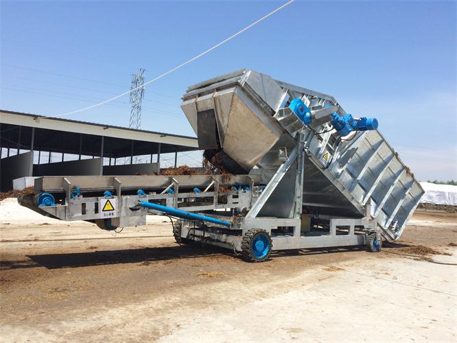 科迈公司借鉴和应用欧洲成熟设计理念和先进工艺技术,根据草料原材料特性以及农场操作人员的操作习惯,对隧道填料机进行了专业化和人性化的优化设计。填料机主要由行走底盘、料仓机构和抛料皮带3部分组成,应用于一期发酵隧道和二期发酵隧道的填料作业,将混合后的原材料均匀的抛洒堆积在隧道内,确保堆料通风顺畅的同时,更注重保持原材料的结构。