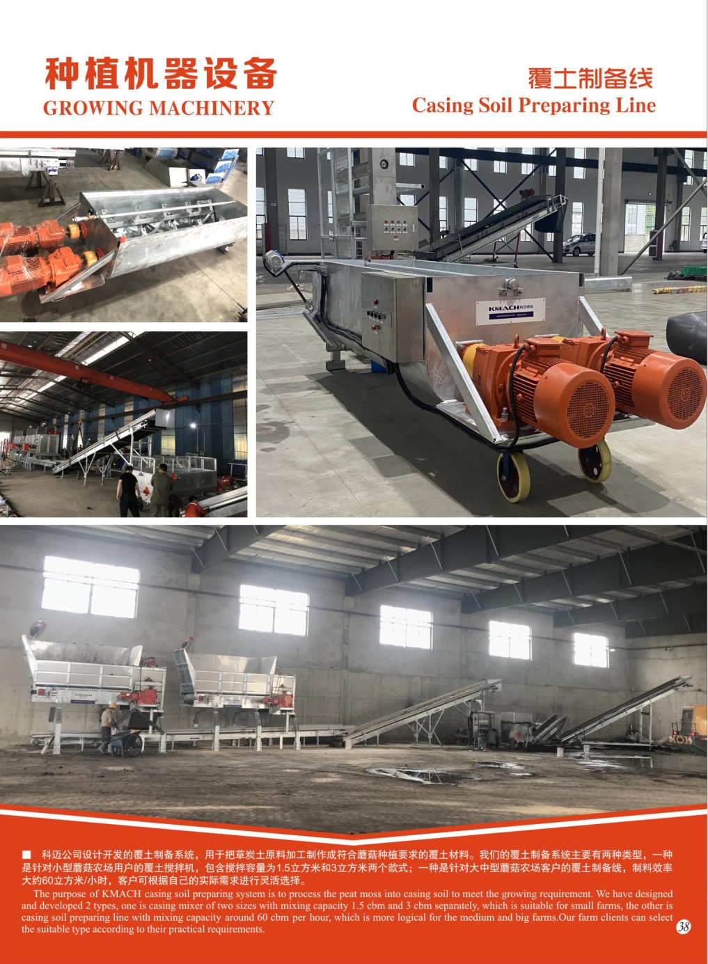 科迈公司设计开发的覆土制备系统,用于把草炭土原料加工制作成符合蘑菇种植要求的覆土材料。我们的覆土制备系统主要有两种类型,一种是针对小型蘑菇农场用户的覆土搅拌机,包含搅拌容量为1.5立方米和3立方米两个款式;一种是针对大中型蘑菇农场客户的覆土制备线,制料效率大约60立方米/小时,客户可根据自己的实际需求进行灵活选择。