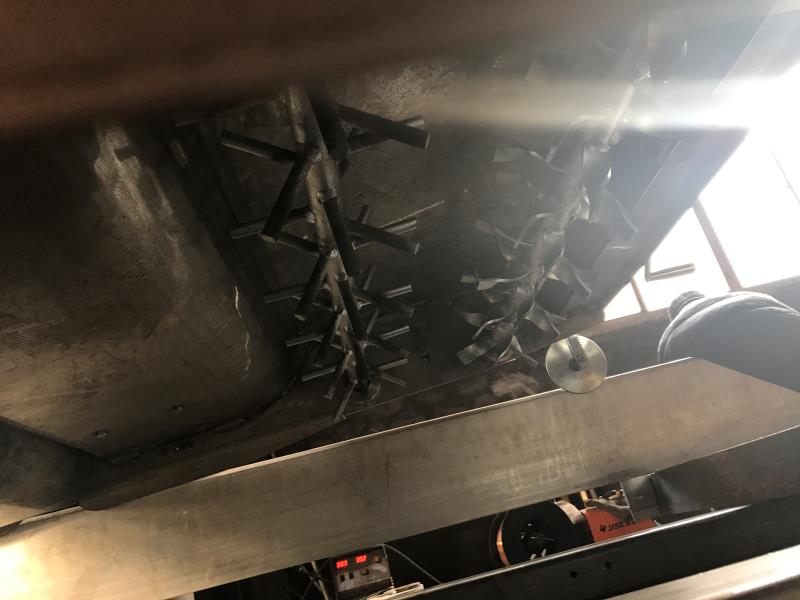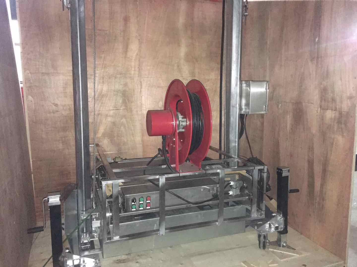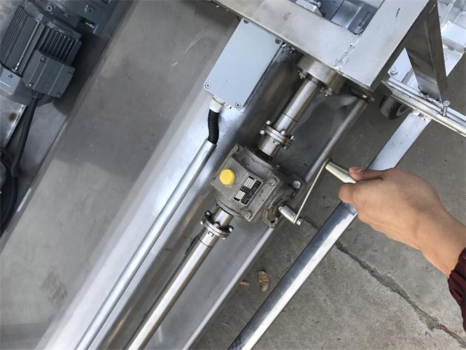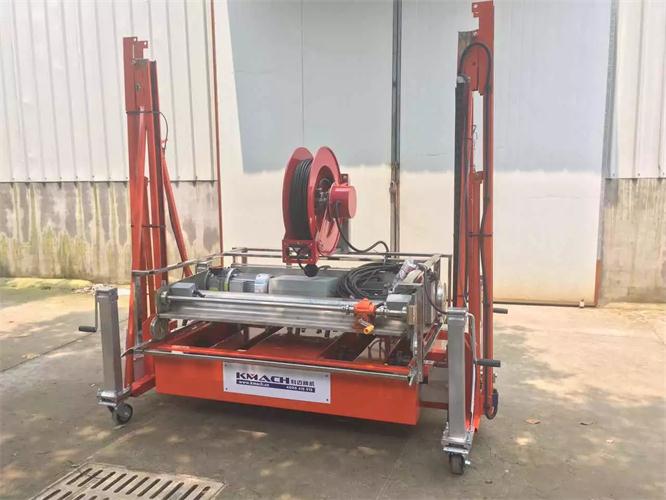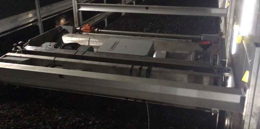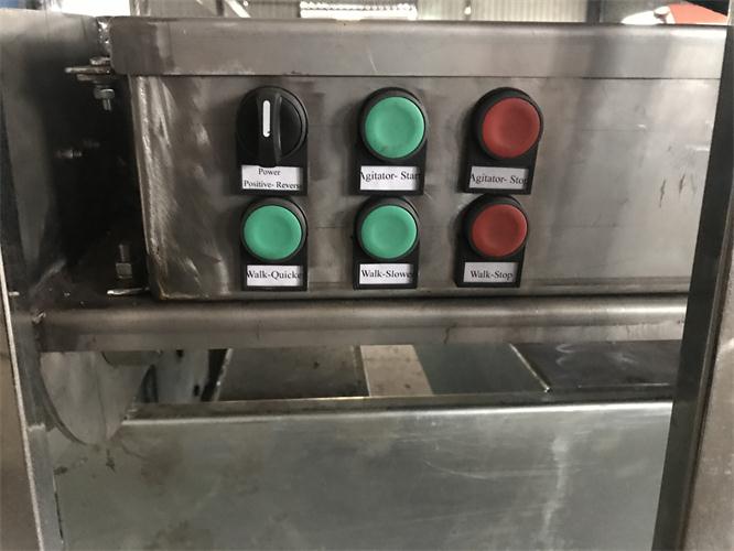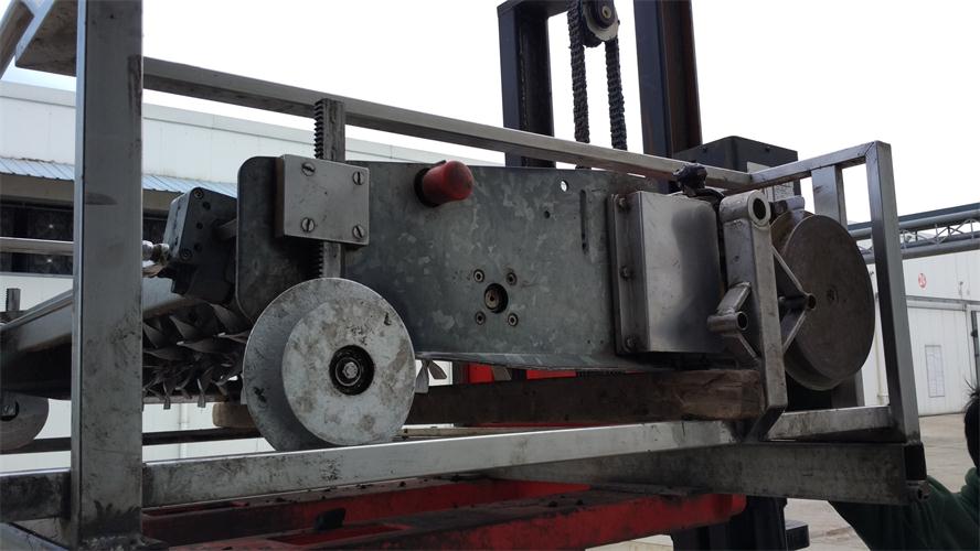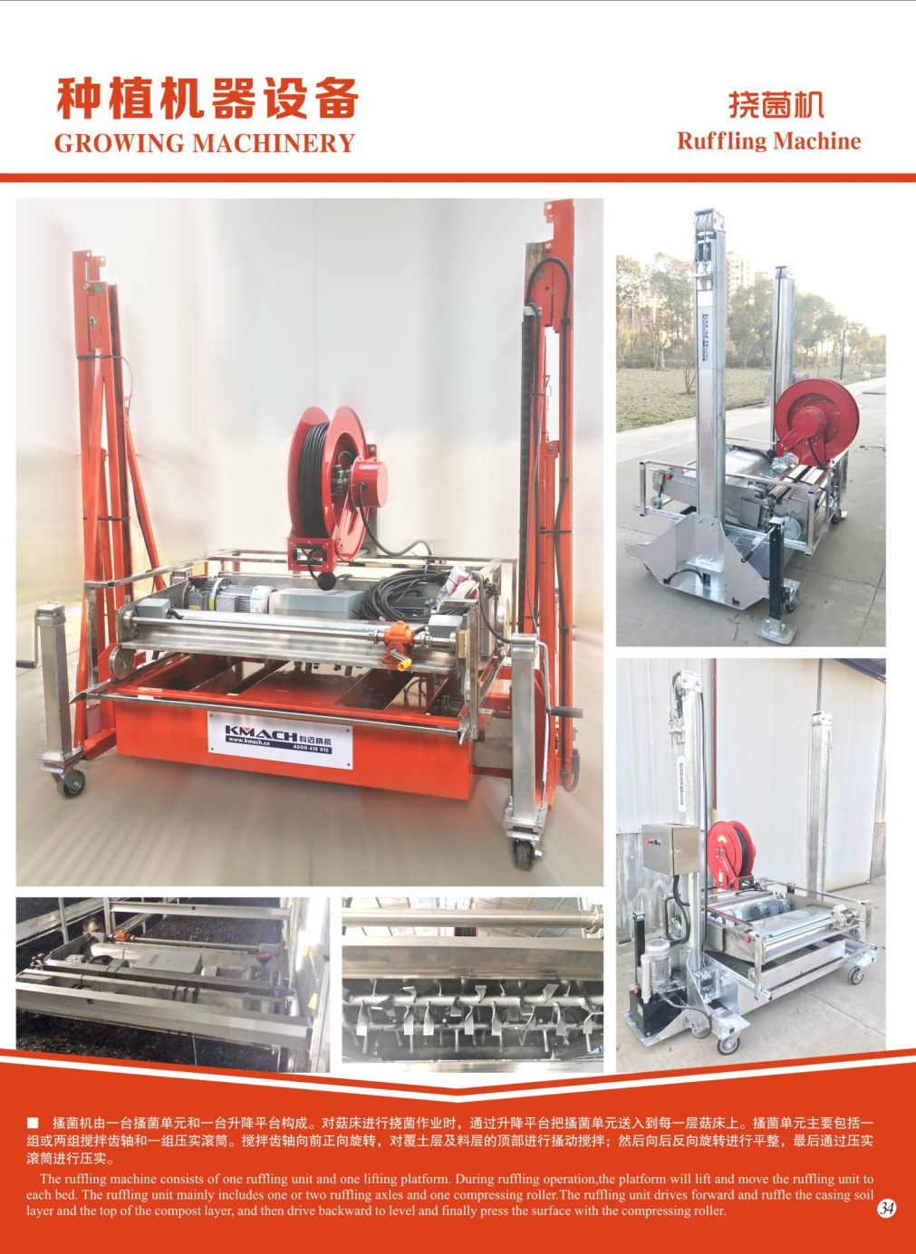 搔菌机由一台搔菌单元和一台升降平台构成。对菇床进行挠菌作业时,通过升降平台把搔菌单元送入到每一层菇床上。搔菌单元主要包括一组或两组搅拌齿轴和一组压实滚筒。搅拌齿轴向前正向旋转,对覆土层及料层的顶部进行搔动搅拌;然后向后反向旋转进行平整,最后通过压实滚筒进行压实。