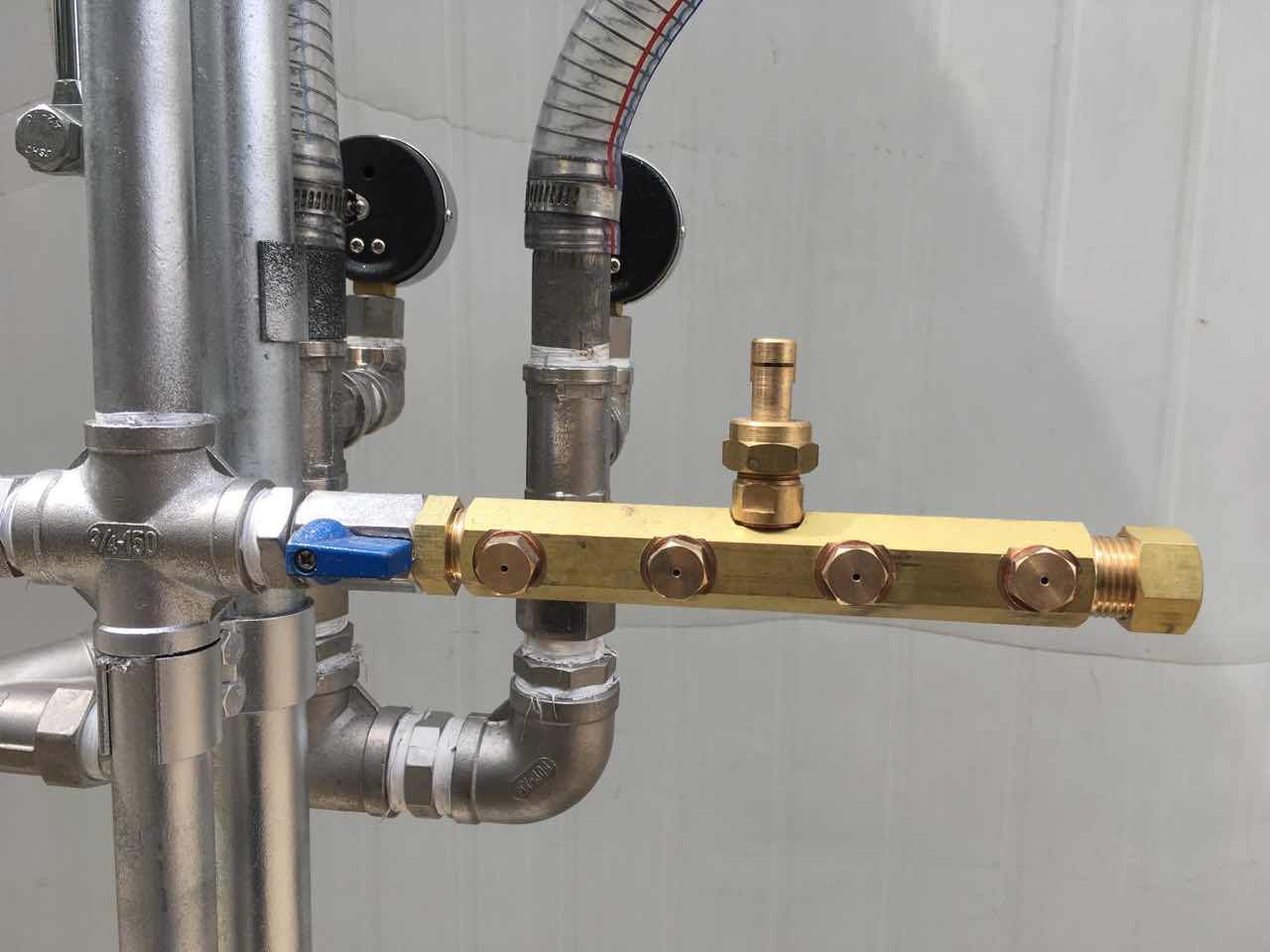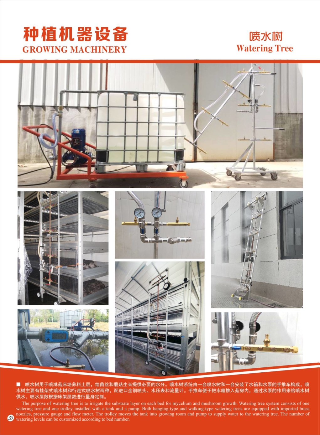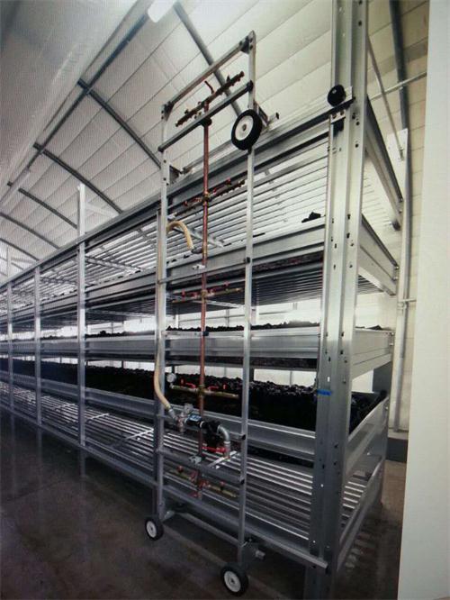 喷水树用于喷淋菇床培养料土层,给菌丝和蘑菇生长提供必要的水分。喷水树系统由一台喷水树和一台安装了水箱和水泵的手推车构成,喷水树主要有挂架式喷水树和行走式喷水树两种,配进口全铜喷头、水压表和流量计。手推车便于把水箱推入菇房内,通过水泵的作用来给喷水树供水。喷水层数根据床架层数进行量身定制。