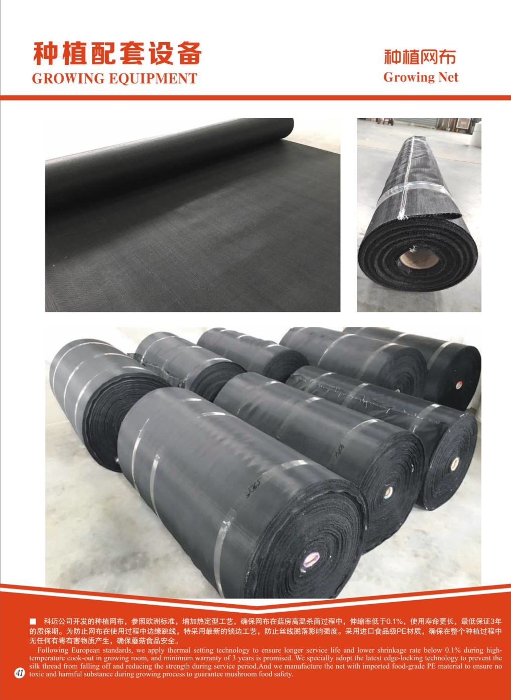 科迈公司开发的种植网布,参照欧洲标准,增加热定型工艺,确保网布在菇房高温杀菌过程中,伸缩率低于0.1%,使用寿命更长,最低保证3年的质保期。为防止网布在使用过程中边缘跳线,特采用最新的锁边工艺,防止丝线脱落影响强度。采用进口食品级PE材质,确保在整个种植过程中无任何有毒有害物质产生,确保蘑菇食品安全。