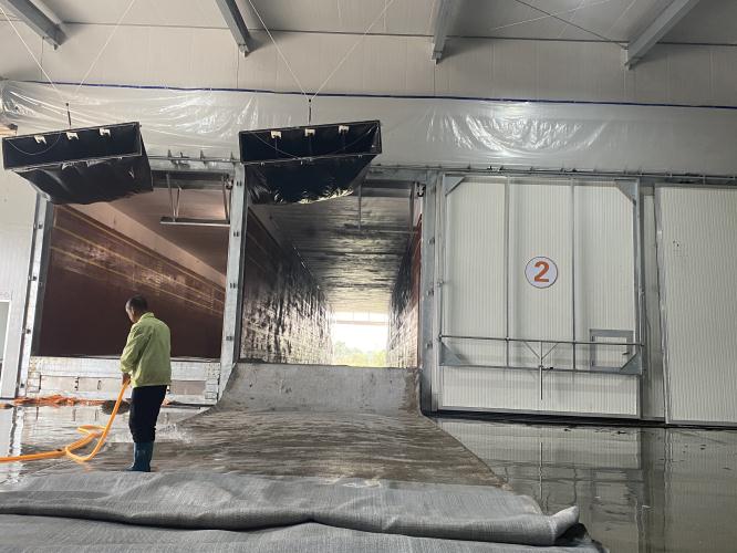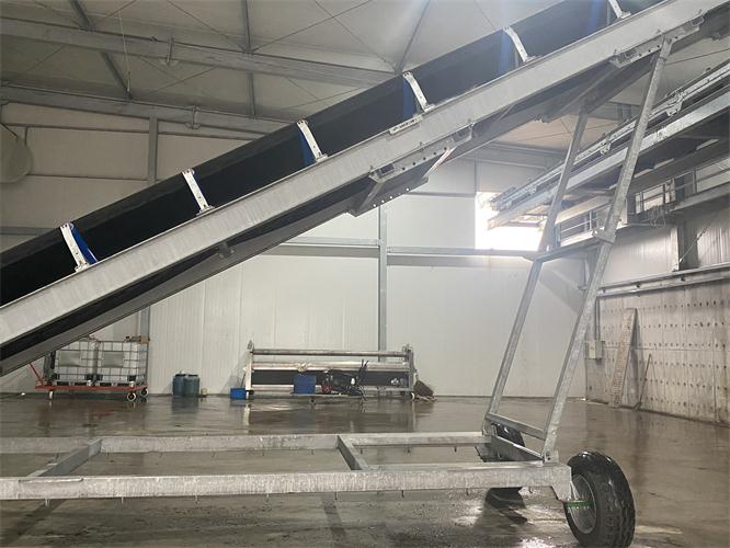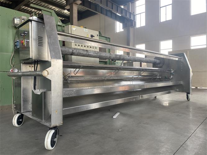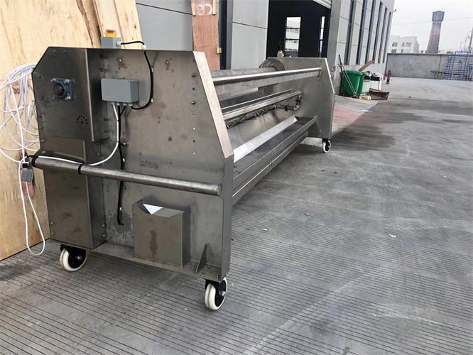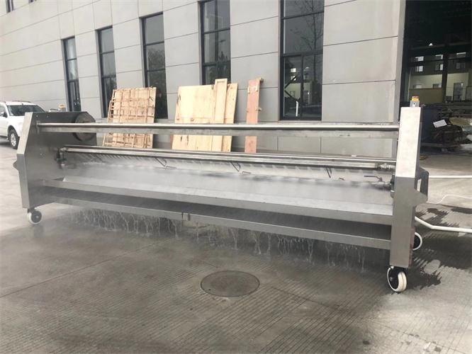 隧道网布洗布机用于把三期发酵隧道出料后的拖网布进行高压喷水冲洗干净。相对于人工清洗网布,科迈洗布机的优势在于清洗速度更快捷,清洗效果更彻底。洗布机的主体框架为不锈钢结构,配置一个卷布机构和一个高压清洗机构,清洗机构由一台高压水泵和一组喷头构成。