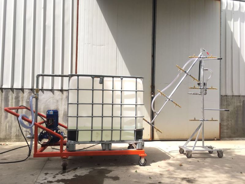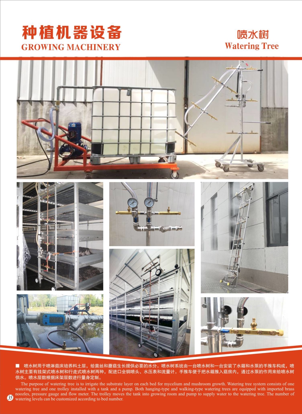 P35 Watering Tree.jpgThe purpose of watering tree is to irrigate the substrate layer on each bed for mycelium and mushroom growth. Watering tree system consists of one watering tree and one trolley installed with a tank and a pump. Both hanging-type and walking-type watering trees are equipped with imported brass noozles, pressure gauge and flow meter. The trolley moves the tank into growing room and pump to supply water to the watering tree. The number of watering levels can be customized according to bed number.