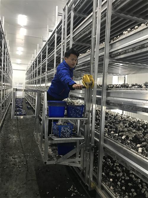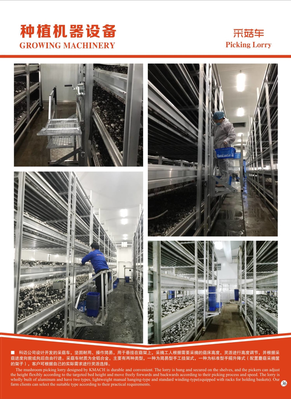 P36 Picking Lorry.jpgThe mushroom picking lorry designed by KMACH is durable and convenient.The lorry is hung and secured on the shelves, and the pickers can adjust the height flexibly according to the targeted bed height and move freely forwards and backwards according to their picking process and speed.The lorry is wholly built of aluminum and have two types,lightweight manual hanging-type and standard winding-type(equipped with racks for holding baskets). Our farm clients can select the suitable type according to their practical requirements.