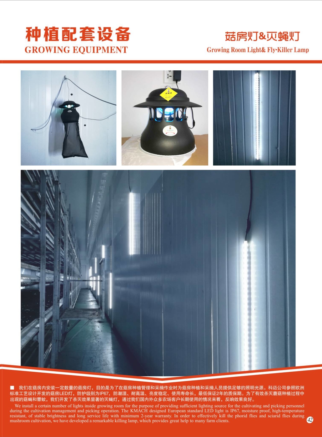 P42 LED Light&Fly-killer Lamp.jpgWe install a certain number of lights inside growing room for the purpose of providing sufficient lighting source for the cultivating and picking personnel during the cultivation management and picking operation. The KMACH designed European standard LED light is IP67, moisture proof, high-temperature resistant, of stable brightness and long service life with minimum 2-year warranty.