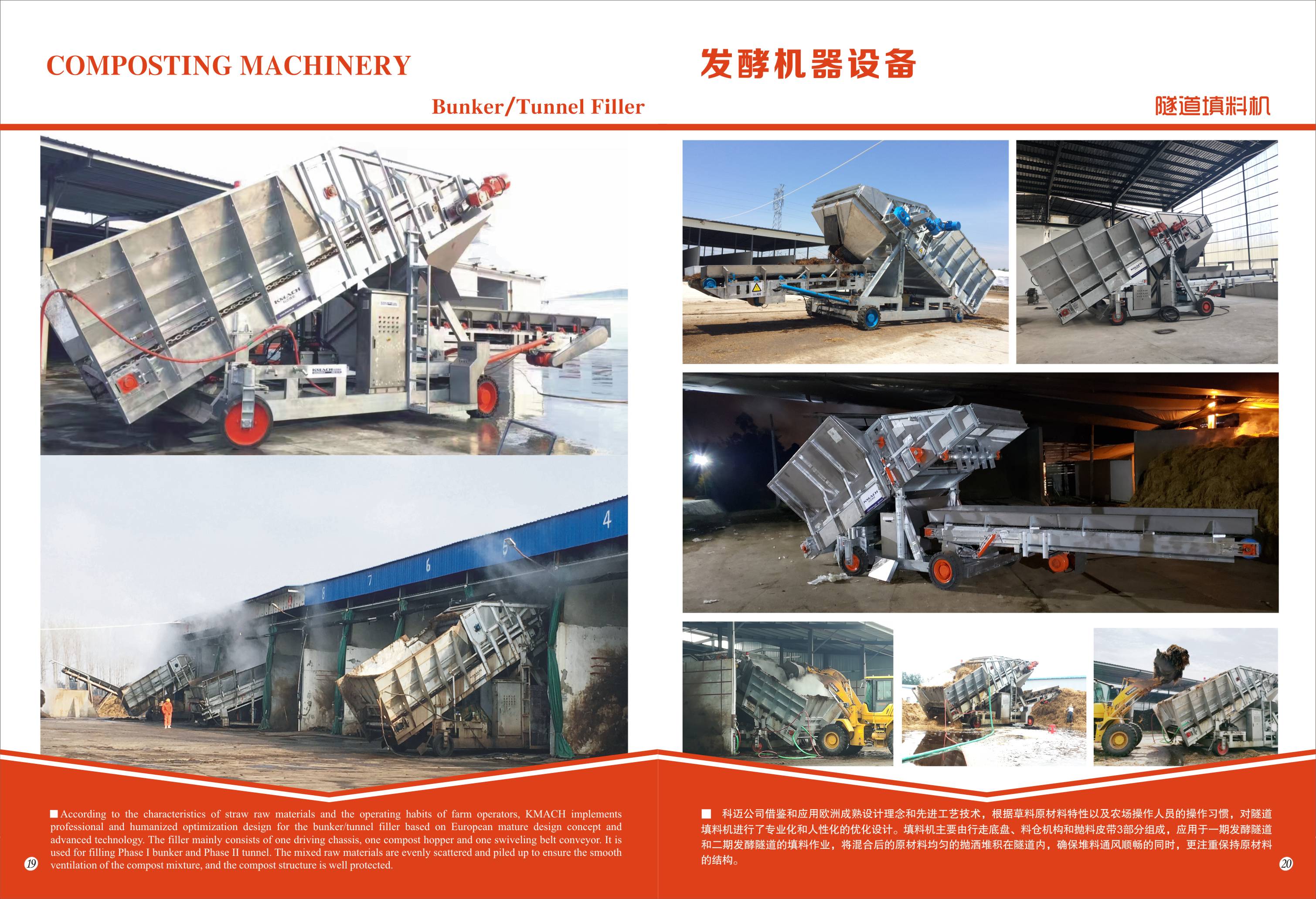 科迈公司借鉴和应用欧洲成熟设计理念和先进工艺技术,根据草料原材料特性以及农场操作人员的操作习惯,对隧道填料机进行了专业化和人性化的优化设计。填料机主要由行走底盘、料仓机构和抛料皮带3部分组成,应用于一期发酵隧道和二期发酵隧道的填料作业,将混合后的原材料均匀的抛洒堆积在隧道内,确保堆料通风顺畅的同时,更注重保持原材料的结构。