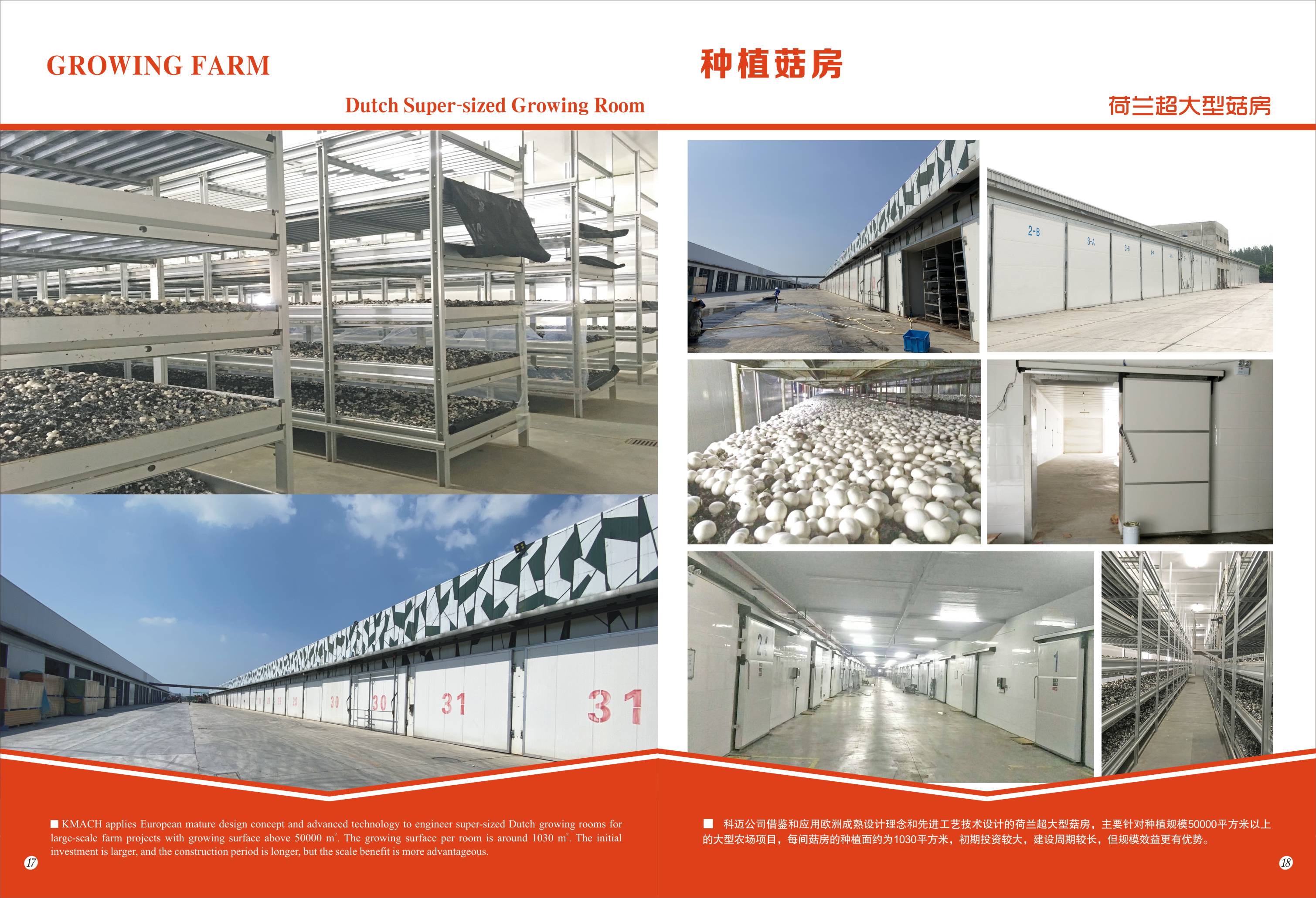 P17-18 Dutch Super-sized Growing Room.jpgKMACH applies European mature design concept and advanced technology to engineer super-sized Dutch growing rooms for large-scale farm projects with growing surface above 50000 m2.The growing surface per room is around 1030 m2.The initial investment is larger, and the construction period is longer, but the scale benefit is more advantageous.