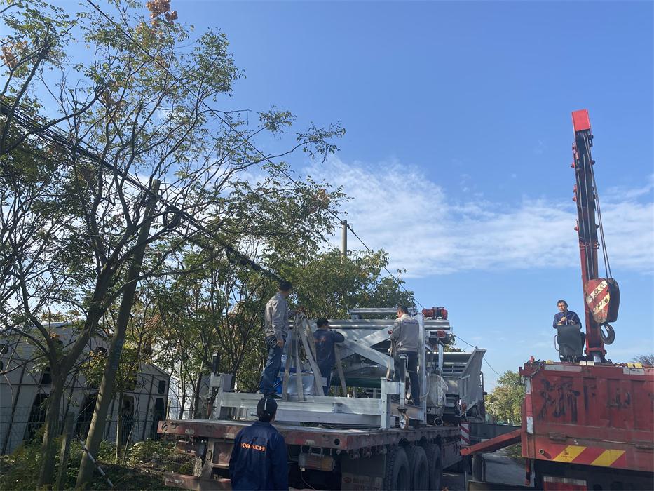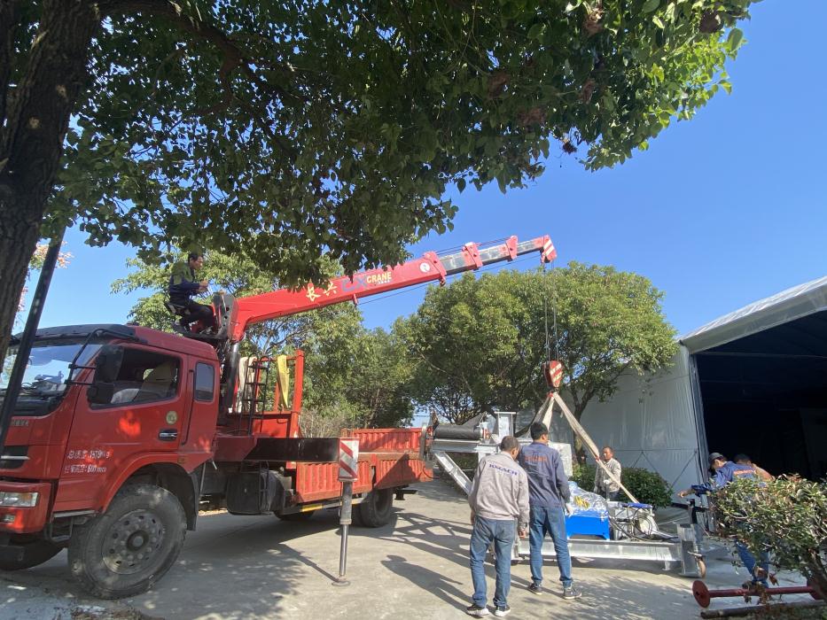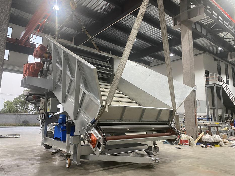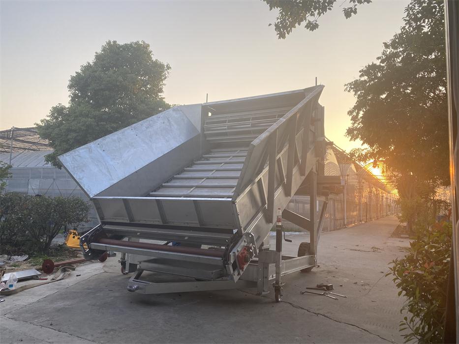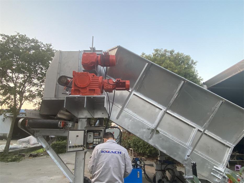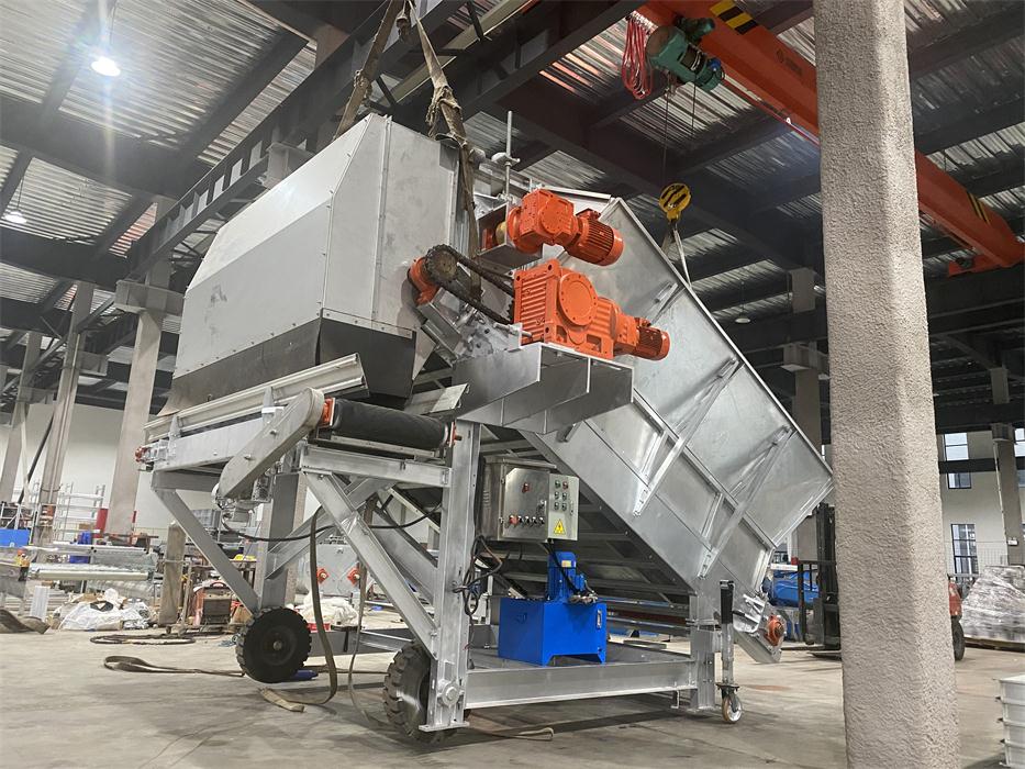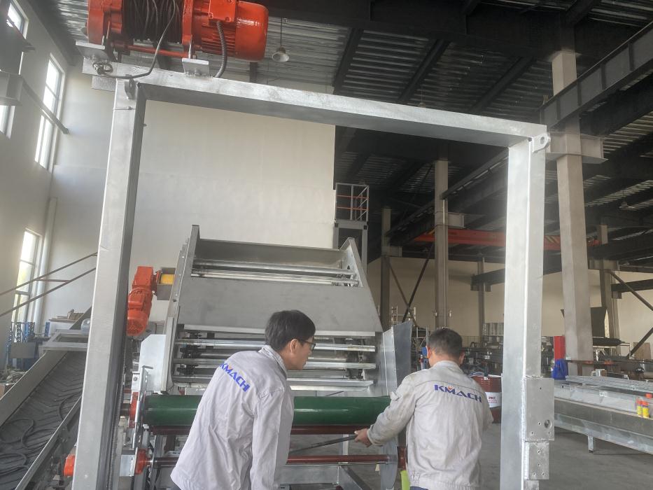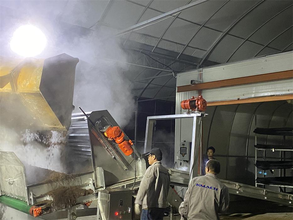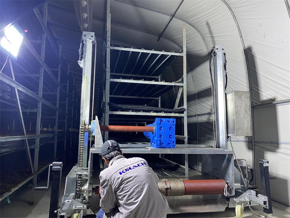 We have customized,manufactured and installed one set of convenient, economical but durable and high-performance simple-version growing room head filling system for Haifeng farm which is a small-scale family farm with 6 growing rooms located in Pinghu city of Zhejiang province. The filling system consists of 1 filling machine and 1 dosing hopper. This farm was filled manually with bulk Phase I compost onto the growing nets laid on the beds and made Phase II compost in the growing room. Each growing room has 3 hot-galvanized growing racks, which are 1.2 meters wide and 25 meters long, 5 beds high.Normally it took around 2 days for 6 to 8 workers to fill a room. After applying the KMACH head filling system, it only takes half day to fill one room.